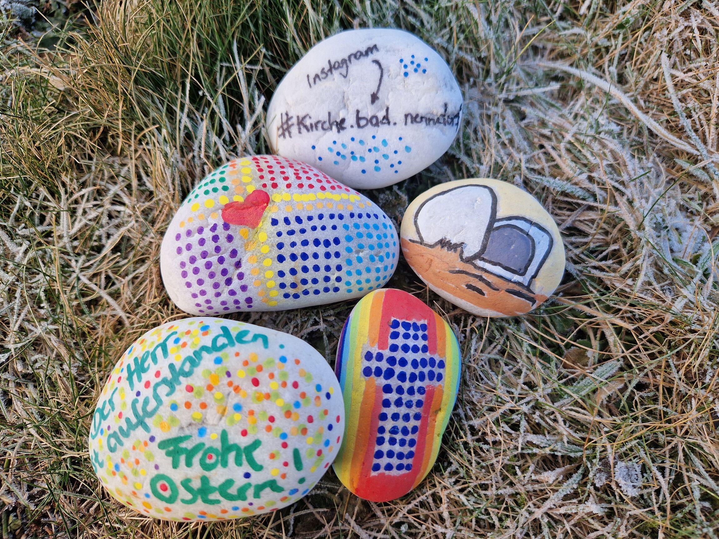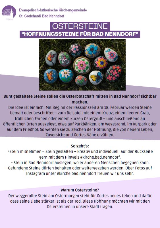 Die Idee ist einfach: Mit Beginn der Passionszeit am 18. Februar werden Steine bemalt oder beschriftet – zum Beispiel mit einem Kreuz, einem leeren Grab, fröhlichen Farben oder einem kurzen Ostergruß – und anschließend an öffentlichen Orten ausgelegt: etwa auf Parkbänken, am Wegesrand, im Kurpark oder auf dem Friedhof. So werden sie zu kleinen Hoffnungszeichen, die von neuem Leben, Zuversicht und Gottes Nähe erzählen.