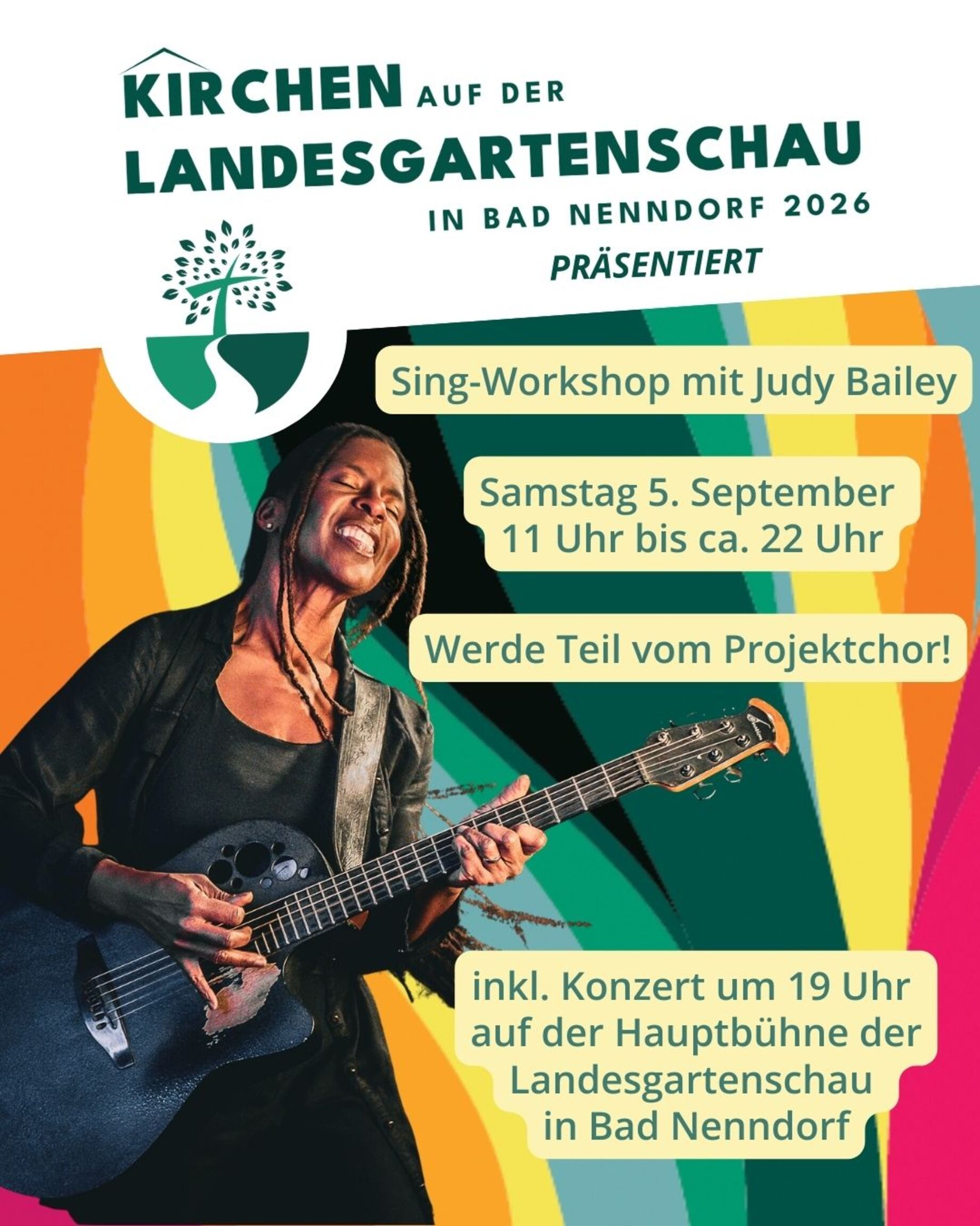 Erlebe einen besonderen Tag voller Musik, Gemeinschaft und Inspiration! Beim Chorworkshop mit Judy Bailey hast du die Möglichkeit, gemeinsam mit rund 120 Sängerinnen und Sängern einen Projektchor zu bilden und am Abend auf der großen Bühne der Landesgartenschau aufzutreten.